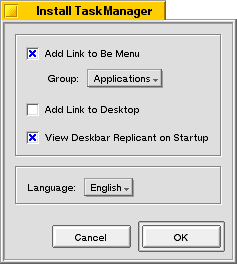 In this dialog you can select you preferred language and create links to Be TaskManager on the desktop and in the Be menu. If you choose to create a link in the Be menu you can select the group in which the link is created by the "Group" drop down box. The "View Deskbar Replicant at Startup" setting causes the deskbar replicant to be shown by default.