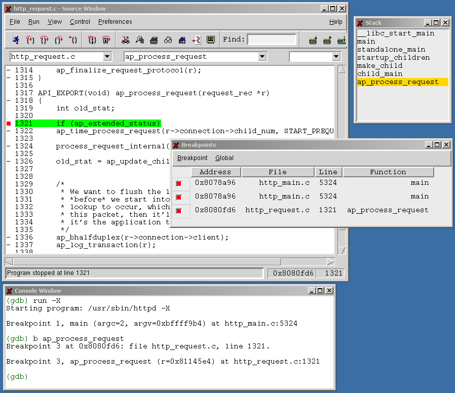 Breakpoint 1, ap_process_request (r=0x95250) at http_request.c:1164